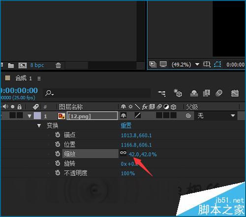 8、这里把它的缩放值调整到一个想要的合适的数值。这里在把它的缩放值更改为42左右。这时就可以看到现在在界面中的素材就是按着自己所移动的锚点的位置来进行缩放。掌握了移动的方法就可以把锚点按着效果来进行移动操作。