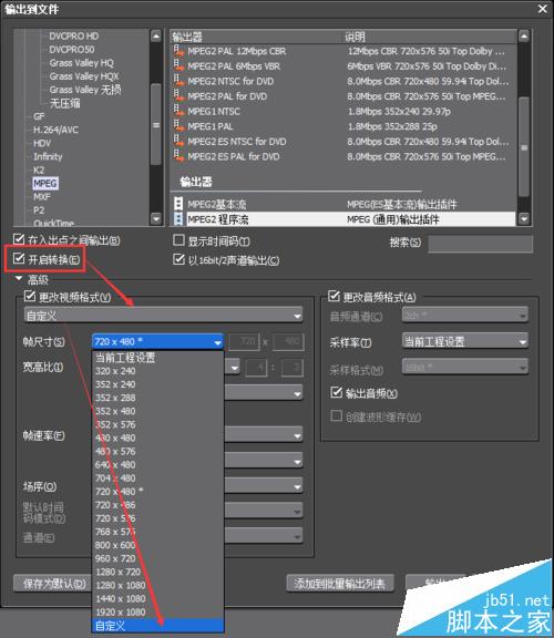 2、只有勾选上“开启转换”,“高级”选项才是可选状态的。“更改视频格式”为自定义,并在“帧尺寸”中选择自定义,在后面输入需要的视频分辨率,确定就可以了。