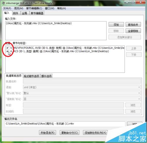 2、将要截取的mkv文件直接拖动到程序处理框内,程序会自动处理视频文件,并显示出视频和音频(有时也有字幕)轨道,如果我们只要截取出某段音乐或视频,我们只要将想要截取的轨道前面打上勾就行: