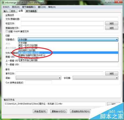 3、然后选择上面菜单栏中的“全局”一栏,在下面的“切割模式”中选择“根据时间码切割为分段”: