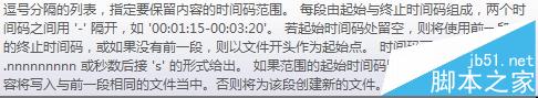 4、这时下面会多出一个“分段”栏,,该栏的作用就是要让我们输入精确的时间码,然后程序就会根据时间码进行剪切,这里的时间格式为:XX:XX:XX-XX:XX:XX,所以你要先看一下视频,定位好你想要截取的时间点哦,把鼠标移动到“下拉”标志处时,程序会显示出具体的操作说明,不过有一点要注意就是这时的符号要在英文状态下输入哦,否则程序无法识别的: