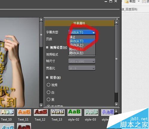 6、将背景属性中 的字幕类型设置为 爬动(向上)