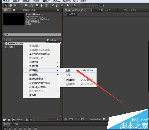 5、右键选择 刚刚导入的视频,选择 解释素材 -》主要
