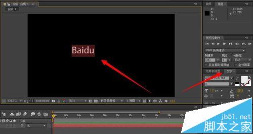 3、在“工具栏”找到“横排文字工具”(快捷键ctrl+t),单击选中,随后鼠标指针发生改变。在合成窗口选定文字创建位置,单击输入文字,在右侧的“文字”一栏可以对文字进行调整。