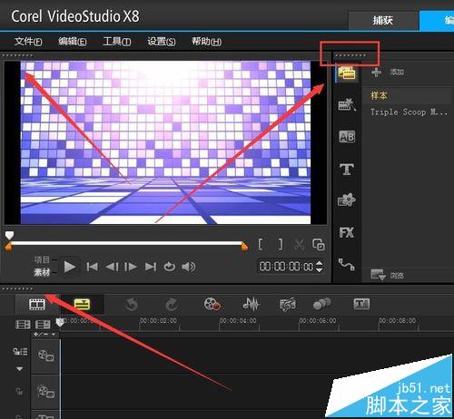 1、这里我们首先打开我们的绘声绘影X8。我们打开绘声绘影X8可以看到我们绘声绘影X8的界面排版的默认界面,这里我们如果需要调整的话,这里我们可以看下下图表示除的地方,然后我们点击那几个小点点的、标。
