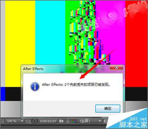 5、当点击打开之后,它就会出现这样的显示:After Effects :2个先前丢失的项目已被发现。