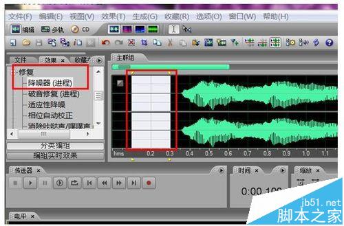 6、删除不要的声段之后,就可以进行降噪处理了,将环境噪音消除。将界面左边的工具栏切换至效果菜单下,选中修复菜单下的降噪,选中录制中发出声音之前的一小段录音,这段录音就是环境噪音,获取其特性并且波段全选后确定之后降噪就算是完成了。