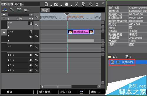 1、首先,将图片素材拖到时间线上合适位置,在时间线轨道上选中该图片;双击信息栏里的“视频布局”快捷图标或按F7快捷键;
