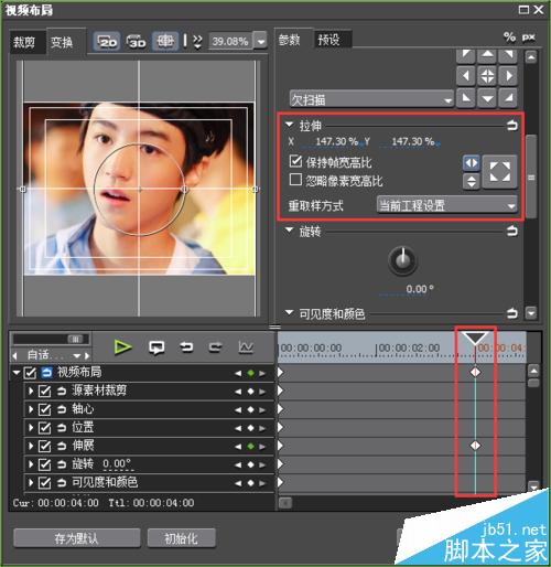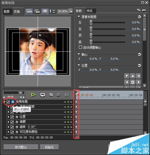 2、在弹出的“视频布局”对话框中,将时间线移至图片开始处,勾选上“视频布局”复选框,并单击“默认关键帧”图标,此时即添加了一列关键帧;