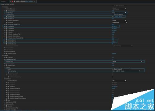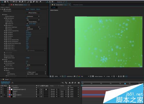 1、新建合成,新建固态层,添加Particular,位置在上面,X轴尺寸占满屏幕,发射器类型为盒子,X轴旋转90度。自定义发射的东西,找一张雪花图,时间采样可以设置为循环,增加雪花的大小,再加点旋转。