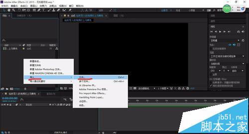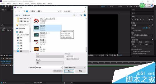 4、打开项目面板,右击该面板,在弹出的快捷菜单中选择"导入>文件..."命令或按住Ctrl+I键打开【导入文件】对话框,选择名为"我的飞车"的视频,单击"导入"按钮,即将"我的飞车"视频导入到项目面板中,如下图所示。