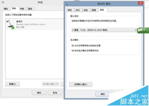 4、下面进入录制的设定,在声音选项卡点击录制,双击麦克风,进入麦克风选项卡,点高级,更改默认格式,同样设为16位48000Hz,录音的设定就完成了。