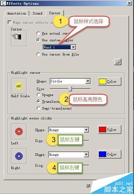5、这个区域分四个部分,第一部分是编辑鼠标样式的,第二部分是编辑鼠标高两区的,第三和第四是编辑鼠标左键和右键单击时的颜色。