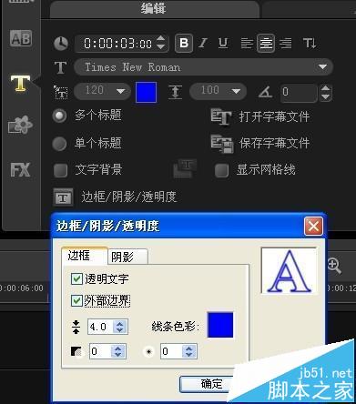 5、接下来点击“边框/阴影/透明度”,弹出相应对话框。如下勾选“透明文字”和“外部边界”,并调整边框宽度和线条颜色,完成镂空特效制作。