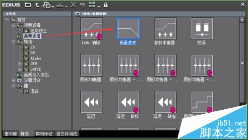 2、打开EDIUS特效面板,点击“音频滤镜”,找到里面的“低通滤波”,并将它拖拽到音频文件上;