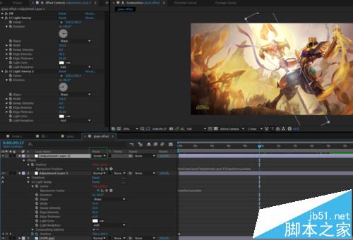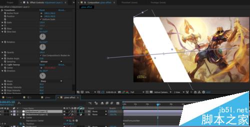3、添加效果:CC Light Sweep,位置K帧,从左往右。扫光的中心写表达式,连接位置,这样扫光就能随着位置移动了。