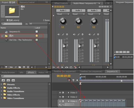 OK,一切准备就绪,继续制作吧。将Project(项目)窗口的"图片"文件夹直接拖拽至Timeline(时间线)窗口Video1(视频1)轨道上,如图所示: