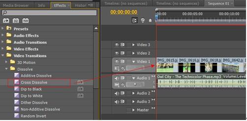在Effects(特效窗口)找到Video Transitions(视频转场)/Dissolve(溶解)/Cross Dissolve(交叉溶解)特效,按下鼠标左键,将该特效拖拽至第一张图片上,如果成功添加,将会出现下图所示效果: