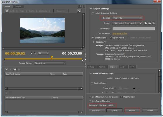 为了再别人的电脑上也可以进行播放,或者在互联网上进行播放,我们必须将其导出成一种常规的格式。好了,现在我们进行输出吧。执行File(文件)/Export(导出)/Media(媒体)命令,弹出Export Settings(导出设置)窗口,在Format一项里提供了各种各样的格式设置,这里为了在网上发布方便和考虑到文件大小问题,我选择FlV格式,然后单击Export(导出)按钮进行导出即可:
