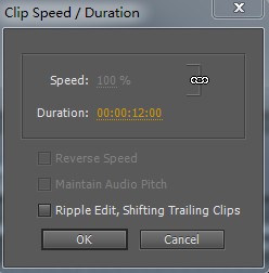 3、在项目面板中将素材拖到时间线视频一轨道上,确认素材选中的情况下,右击,找到speed duration(速度持续时间命名)将当前时间设为00:00:12:00