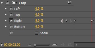 6、 下面制作从右往左的裁剪效果。选中素材,再次将crop()拖到素材上,在特效控制台面板上将right值增大,直到第一行的文字都被裁减掉为止,参数设置好后,打上一个关键帧。在特效控制台面板中,将当前时间设为三秒,将右裁剪数值减小,直到第一行文字都出来为止,此时系统会自动生成一个关键帧。(参考数值:第一个关键帧为85,第二个关键帧为8.)