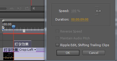7、 第一行文字的打字效果制作完毕,下面制作第二行文字的打字效果。在时间线面板中将当前时间设置为三秒,在项目面板中将素材拖到时间线视频二轨道上,选中素材,右击,找到speed duration(速度持续时间命名)将当前时间设为00:00:09:00
