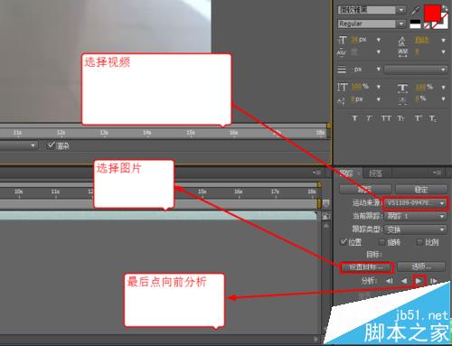 6、在右下角找到“跟踪”列表,把“运动来源”选择 视频,“目标”选择 图片,确认无误后点击“向前分析”