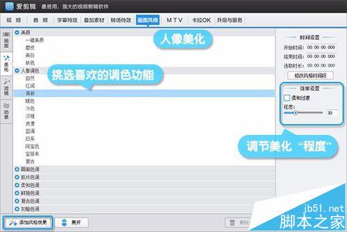 话不多说,立即开启美化视频模式。在爱剪辑的“画面风格”面板的“美化”栏目下,有可以为人物美化的“美颜”与“人物调色”栏,栏目下有许多能将人物气色变得更好看上去更美丽的调色功能,我们只需要在这其中挑选适合画中人肤色、气质的调色方案即可。
