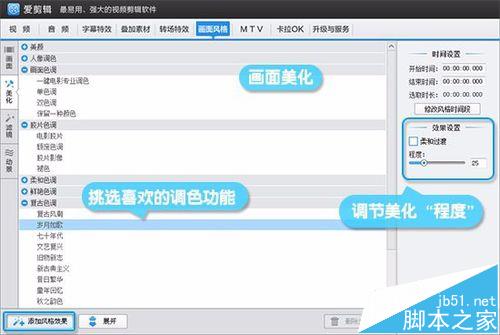 除了人像美化,我们还能利用“美化”栏目下的“画面色调”、“胶片色调”、“复古色调”等等,令视频画面更具大片级效果。添加调色功能后,可通过主界面中央的“程度”功能,调节至满意的效果为止。