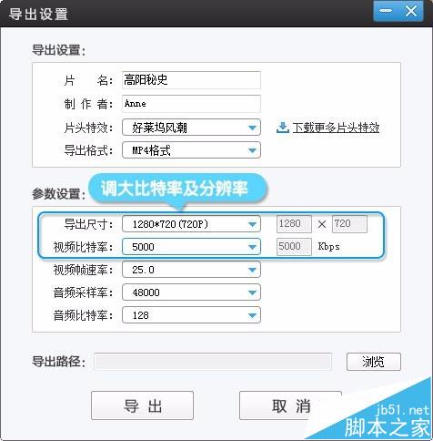 注意:导出时,请在“导出设置!”对话框将视频分辨率调至720p或以上,比特率调至3500kpbs或以上