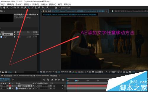 2、在该合成视频中添加你想要的文字。选择“T(文字工具)”如图箭头指向。并在预览窗口点击输入你想要的文字。