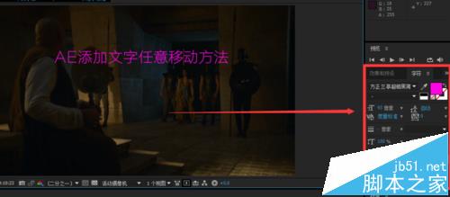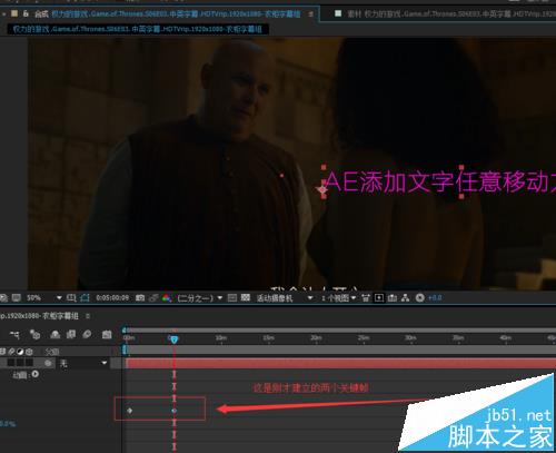 7、在预览器移动文字到你想要的位置,如图,此时你就可以看到有2个位置关键帧了,预览一下视频你就可以看到你添加的文字非静态文字,而是移动的了。添加移动文字就这么简单。添加移动的图片也是一样的,导入图片,然后给他建立位置关键帧即可。