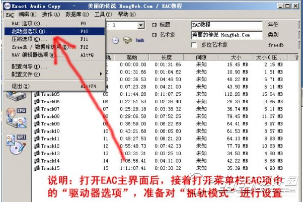 (02)接着打开菜单栏EAC项中的“驱动器选项”,准备对“抓轨模式”进行设置