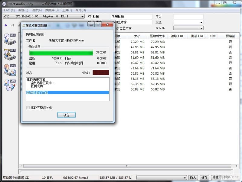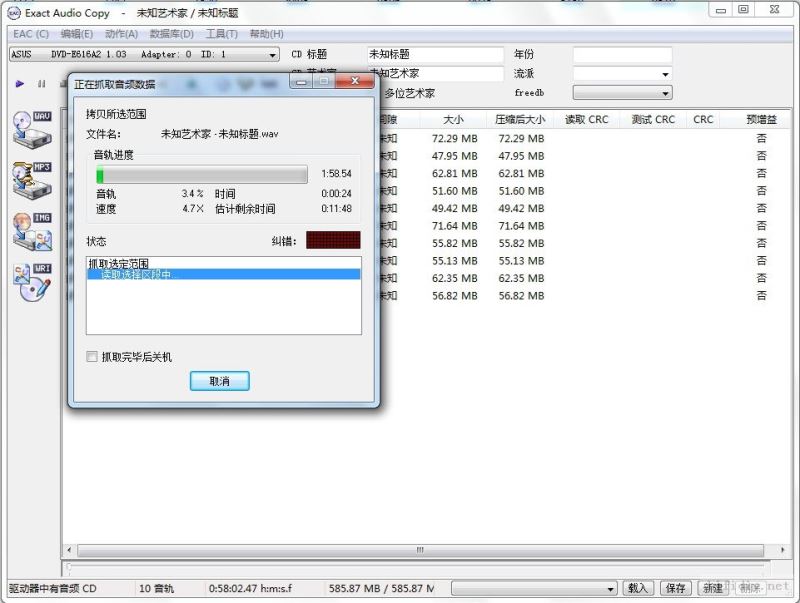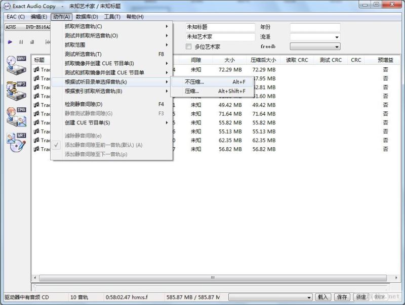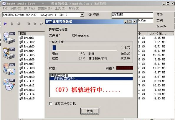 6、开始抓取 WAV音轨,用EAC抓取WAV音轨有两种方式,一种是抓取整张CD的整轨WAV文件与CUE文件,一种是抓取分开一首一首的单