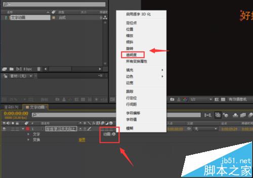 3、打开文字属性栏,在动画栏中找到“透明度”,并添加到文字属性中。