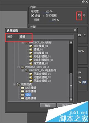 4、然后在右边属性出,勾选上“内部”,然后选择滤镜,我们可以在搜索处直接打上模糊然后进行搜索