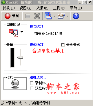 1、启动CamRecorder,在录屏小窗口界面先选择录屏区域,简单的可以选择全屏,当然也可以自定义区域大小。