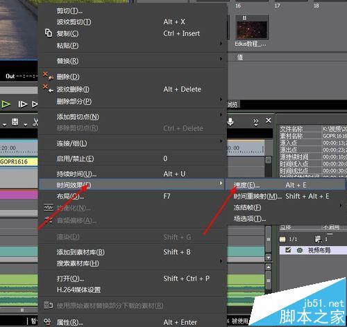 调整素材速度的快捷键:Alt+E。