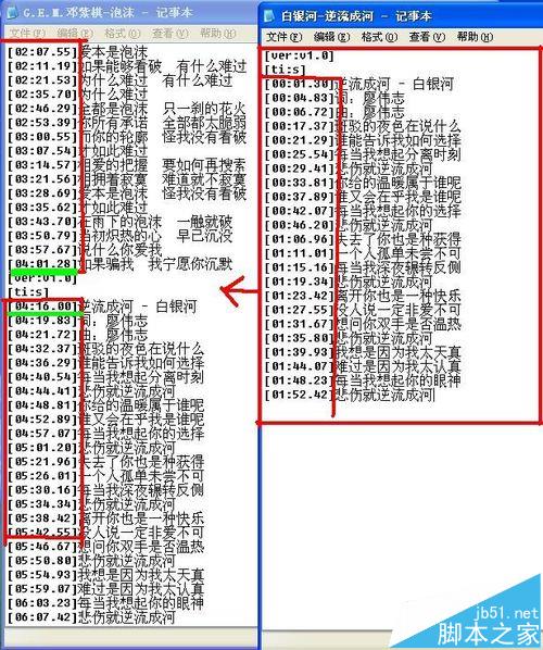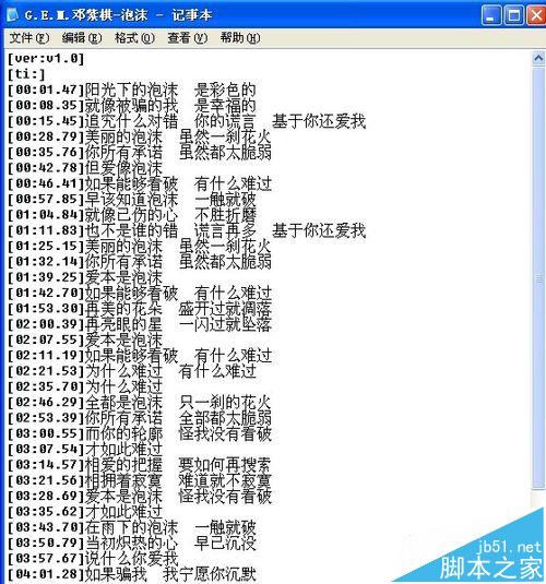 2、把俩个歌词文件打开后将其中一个的歌词文字复制到另一个的后面然后修改好前面的时间(音乐的结束时间和歌词的结束时间是不一样的,就比如说前一首歌泡沫的音乐结束时间是04:16,而歌词是04:01)所以第二首歌的歌词开始的时间应该是04:16而不是04:01,调好时间后点击上面的文件保存