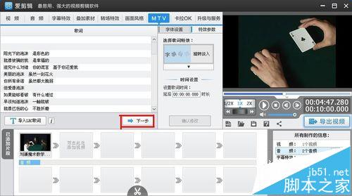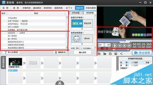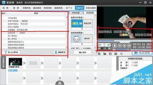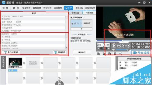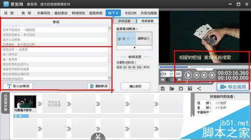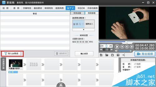 3、然后打开爱剪辑插入视频和音乐后点上面的MTV,然后点下面的导入lrc歌词,然后找到刚刚编辑好的歌词点下面的打开插入