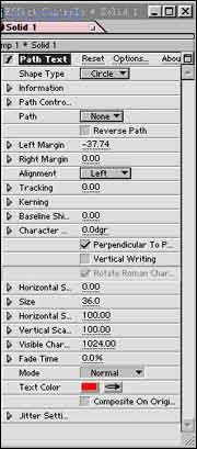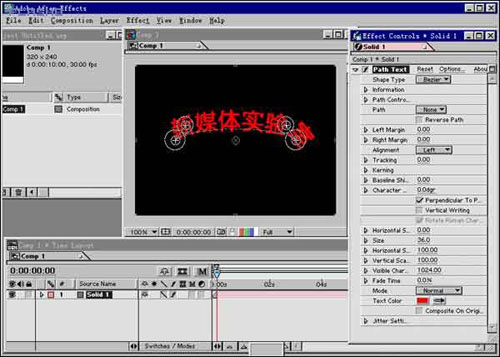 首先我们要点Composition/New Compositio建立一张图纸以用于在上面作字Layer/New Solid 在点Effect/Text Path Text出现对话框输入你需要的文字,完成后点OK