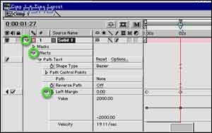 下面我们可以为路径字在Time Layout Window设置效果点了。在这里效果点可以参考编辑篇的效果点来完成,点图纸前的三角 在点Effect再点Left Margin进行设置。在0秒处设一个效果点在两秒处设一个效果点,移动字的路径。这时就可以预示一下效果了。