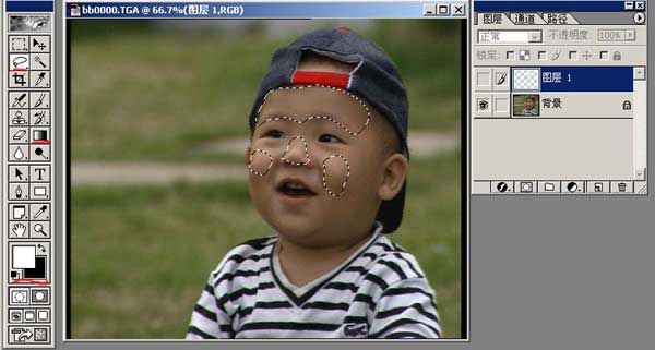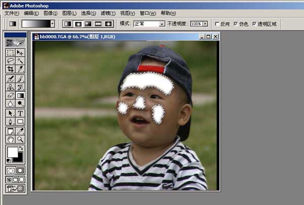 在ae中,我想displacement map应该可以实现。.要想有凸凹,那么置换的图应该是一张黑白灰图。首先我想到把这张图以luma方式选择脸部并形成黑白灰图,实践证明失败,有兴趣的朋友可以试一下,由于光的分布不是有规律的,置换出来的凸凹将会变得没有规律。因此根据上图,我用选区勾勒了面部突出的位置,用白至灰把选区进行填充,表示这里的高低过程,选区加5个像素的羽化,图如下: