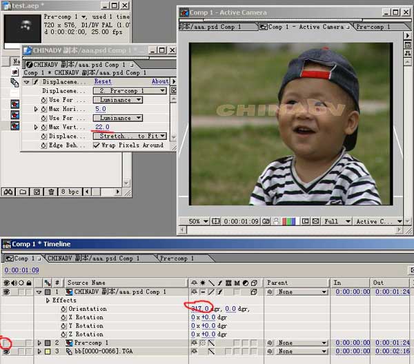 把上述两个嵌套和孩子的序列图调入同一个时间线上。给字的合并层加上三维,参数如上,关闭a.tga合并层的可视,对字的合并层加effect/distort/displacement效果,参数分别按上图调整。好了,preview吧,端起caffe,打开音乐,欣赏吧!
