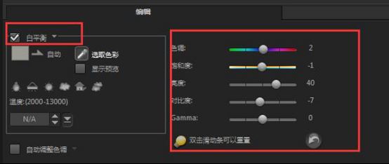 1、选择其中的一个素材,双击,在选项中编辑中,选择“色彩校正”,然后勾选白平衡,调整右侧的色彩数值;