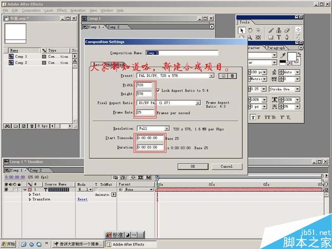 现在我们开始制作,首先建立一个新的合成,设置如图。