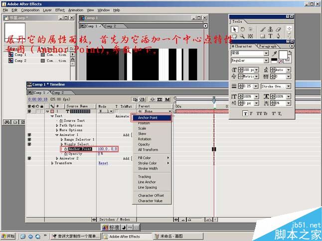 展开它的属性面板,道德为它添加一个中心点,特性如图(Anchor point),参数如图。