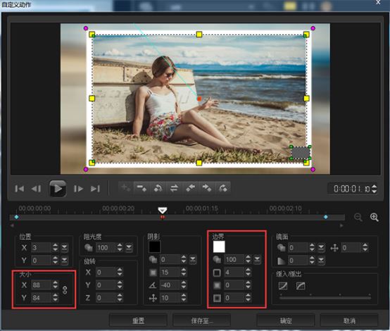 1、首先为照片添加边框,在图片上右键单击,选择“自定义动作”, 将编辑的尺寸设置为“4”,颜色设为白色,如果想要边缘柔和一点就对柔化边缘进行设置;