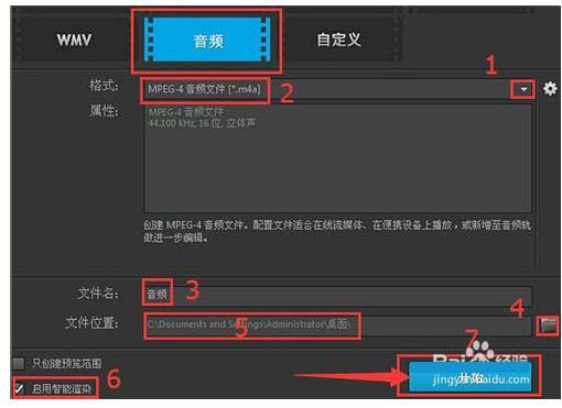 7、在弹出的窗口中,点击倒三角,里面有四种音频格式,你可以任意选一种格式,我这里选MPEG-4音频文件单击,然后起一个文件名,再点开黄色文件夹,找一个保存的位置,我这里暂时保存到桌面,启用智能渲染前面打勾,最后单击开始,如图所示。