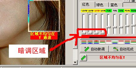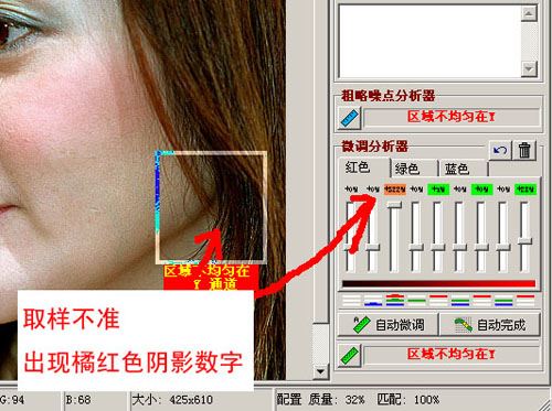 红色区域表示错误的数据,橘红色表示无法确认的数据。这通常都似乎因为取样区域纯在不应该被定义成噪点的抖动信息。你可以按CTRL+Z来撤消错误的取样从新分析,或者你能够清楚的了解错误的程度手动调整滑竿来效正数据。 当你的分析器完全是绿色或无阴影时,并不代表你的噪点定义工作完成,因为默认的区域仍然是不准确的。这时你可以通过自动完成或自动微调来补充未分析出噪点的区域的数据。通常它们是根据已经确定的噪点数据的趋向给空白区域填充,但有时我们可以手动调整一些我们可以确定的区域使数据更加精确。比如示例图象中头发等暗调区域是不需要进行降噪处理的,那么我们可以将3通道中暗吊部分的噪点定义成无,也就是把滑竿条到最低。